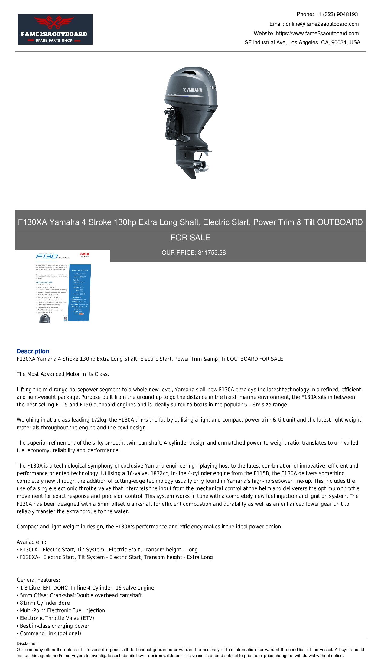 • F130LA –  Electric Start, Tilt System – Electric Start, Transom height – Long