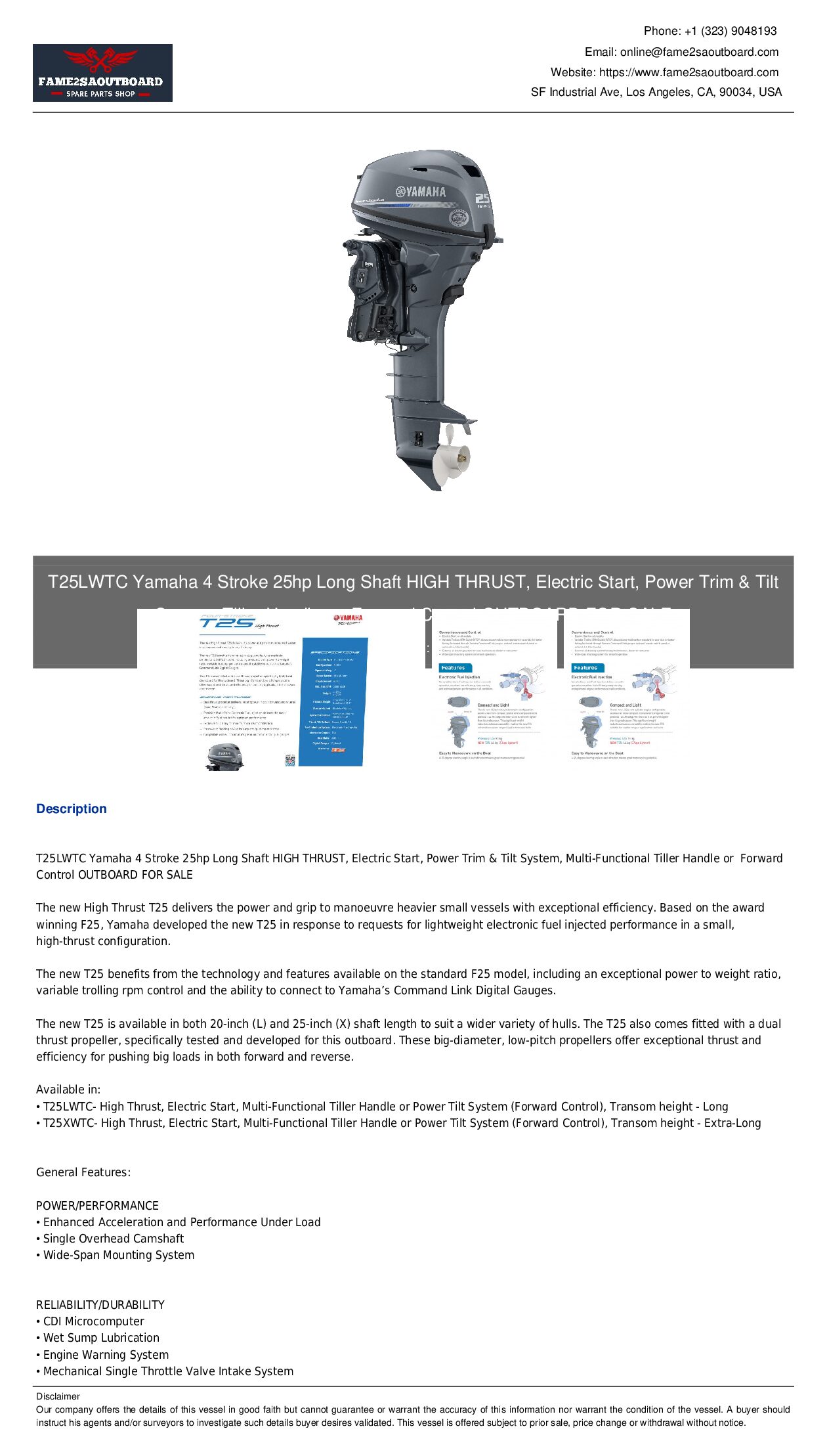 T25LWTC Yamaha 4 Stroke 25hp Long Shaft HIGH THRUST, Electric Start, Power Trim & Tilt System, Multi-Functional Tiller Handle or Forward Control OUTBOARD FOR SALE